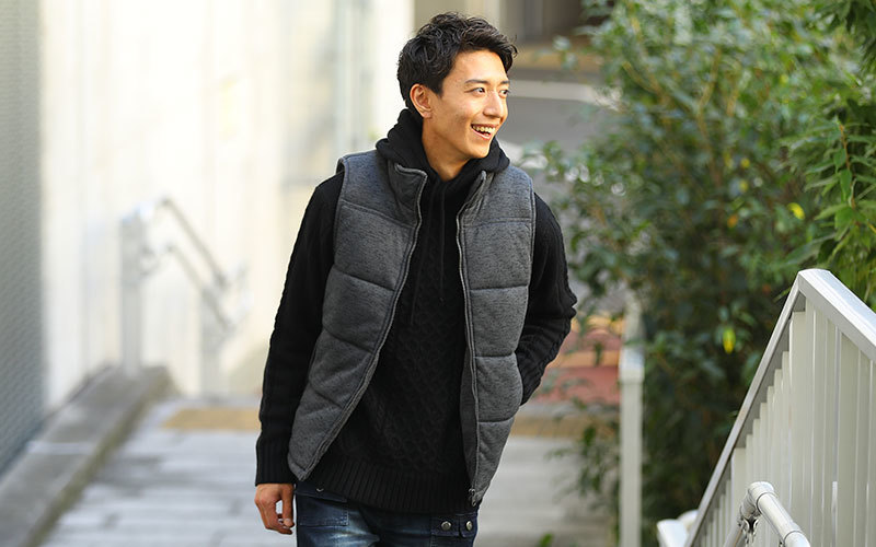 中綿のニットベストもメランジがおすすめ。おしゃれな素材感なので、デートコーデでも、アウトドアでも一枚羽織るだけで主役級になるアイテムです。中に合わせるシャツを変えることで、秋~冬にかけて長い期間楽しめますよ。