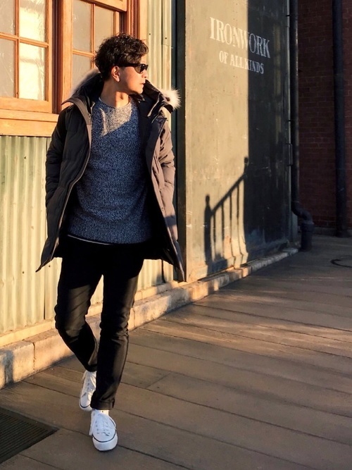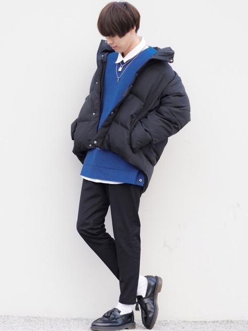 こちらは、ダウンジャケットにブルーのニットを合わせたメンズコーデです。ニットの下には、白シャツをレイヤードして爽やかなコーデを演出。スラックスと靴を同系色でまとめると、こなれ感が引き立つ着こなしに。ブラックコーデの中に、ブルーのニット持ってくることで程よい差し色がプラスされ、華やかできれい目なスタイルが完成します。