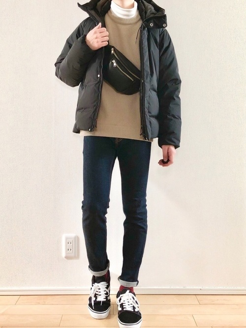 黒のダウンジャケットにベージュのインナーを合わせたメンズコーデです。ボディバッグを斜めがけで取り入れることで、トレンド感がプラスされた着こなしに。バッグと同系色のスニーカーで統一感をプラスしています。デニムは濃いブルーのものをチョイスし、裾をロールアップすることで、靴下のレッドカラーがアクセントになりこなれ感がUP。