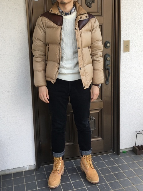 ベージュ系のダウンジャケットのインナーには、ホワイトのニットをチョイス。チェックシャツをレイヤードして首元にポイントをプラスしています。ブーツはダウンジャケットと同じカラーで統一。ボトムスには、ブラックカラーのデニムをロールアップして取り入れることで、アクティブなニュアンスが溶け込みますね。