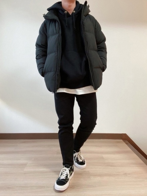2.ダウンジャケット×パーカー×Tシャツ×ブラックデニム