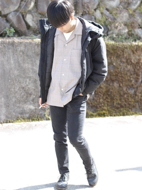 黒のダウンジャケットに、グレーのシャツ、ブラックデニムを合わせたコーデ。程よくゆとりのあるインナーをチョイスすることで、大人の余裕のある着こなしになります。ダウンジャケットはパーカーが付いているので、インナーのシャツは、オープンカラーのものを合わせてしっかりとボリュームダウン。白のTシャツのレイヤードも上手くマッチしていますね。