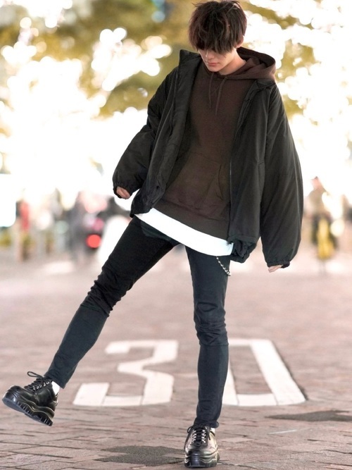 上下のカラートーンがメリハリのあるモノトーンコーデ。こちらもYシルエットを意識して上手にまとめています。パーカーに白のTシャツをレイヤードして裾から出せば、コーデバランスも絶妙。足元にもモノトーンカラーのスニーカーをプラスすることで、アクセントにもなりますね。
