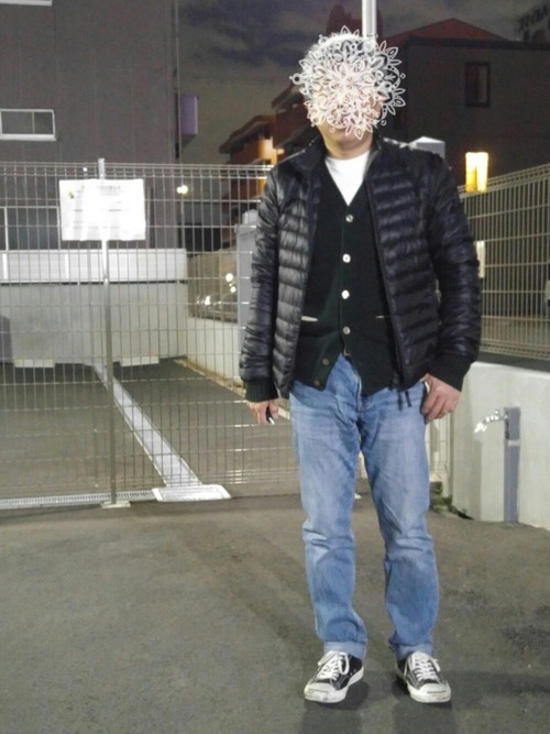 ダウンジャケットのインナーに、カーキカラーのカーディガンと白シャツを投入。黒のチノパンをボトムスに取り入れて、カラーバランスが程よいメンズコーデになっています。足元には、ローファーとスニーカーの中間のようなアイテム「レザースポックシューズ」をプラスし、全体の雰囲気を上手にまとめたメンズコーデです。