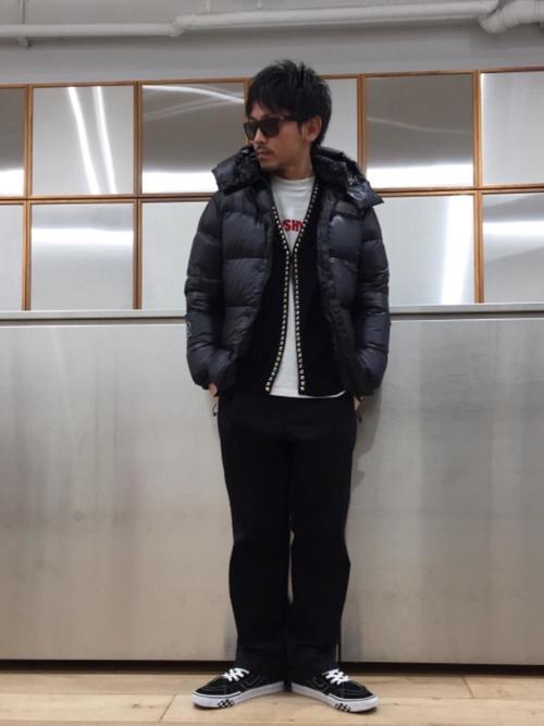 ダウンジャケットに合わせたカーディガンは、スタッズ付きでコーデのちょっとしたポイントに。Tシャツをレイヤードしてプラスすることで、より引き立ちます。黒のチノパンと合わせればカッコいい大人カジュアルコーデの完成です。