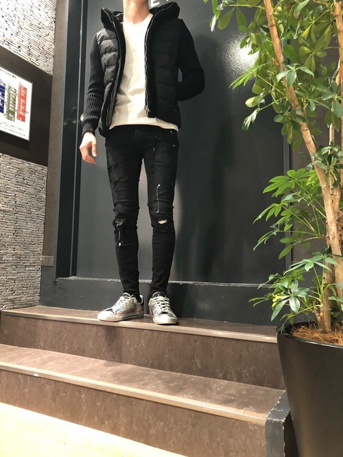ダウンジャケットに、白のTシャツ、黒のリメイクデニムを合わせたモノトーンメンズコーデ。どことなくエレガントな雰囲気のダウンジャケットのインナーに、Tシャツを加えることでカジュアルな印象に。ダメージが施されたデニムの質感と程よく合いますね。足元に、メタリックカラーのスニーカーを取り入れて、スパイスの効いた着こなしに仕上がっています。