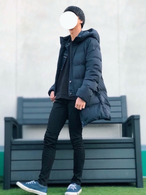 アウターからボトムスに至るまで、黒一色のオールブラックコーデ。ダウンジャケットは、丈が少し長めのものを合わせています。カットソーの上に、デニムジャケットをレイヤードしておしゃれ感UP。黒のスキニーデニムを合わせれば、メリハリのある着こなしが叶います。足元のブルーのスニーカーが、ちょっとしたワンポイントになっていますね。