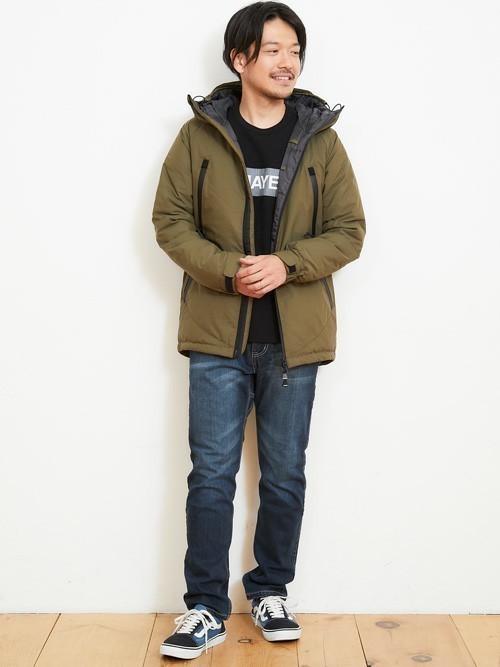 カーキでスタイリッシュな装いのダウンジャケットに合わせるのは、黒のプリントTシャツ。落ち着きのある程よいカラーのクライミングパンツと合わせて、大人カジュアルな印象を醸し出しています。足元のスニーカーは、パンツのカラーと色味を合わせて統一感UP。リラックスした雰囲気漂うメンズコーデです。