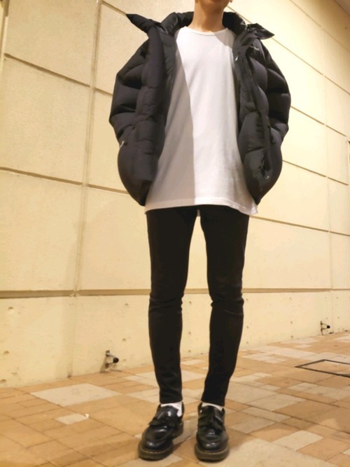 黒のダウンジャケットに、ロング丈の白のカットソー、黒のスキニーパンツを合わせて。シンプルなモノトーンコーデですが、靴にローファーを持ってくることでこなれた印象に。ジャケットにボリュームがある分、ボトムスはスキニーで引き締めています。Yラインを上手に意識したメンズコーデです。