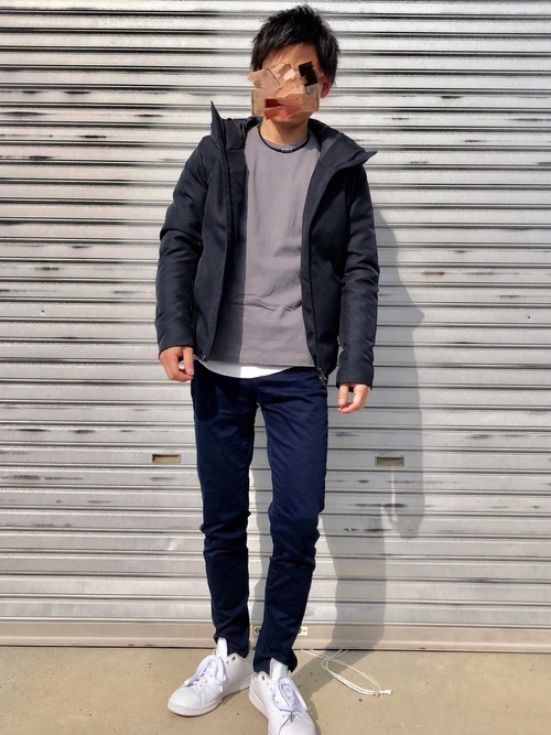ダウンジャケットに、心地よいグレーカラーのカットソーを合わせて。グレーのカットソーの下には、白のカットソーをレイヤードしてコーデしています。ボトムスは、ブルーカラーのパンツをチョイス。白のスニーカーがいいアクセントになっていますね。全体のコントラストが絶妙なコーデです。