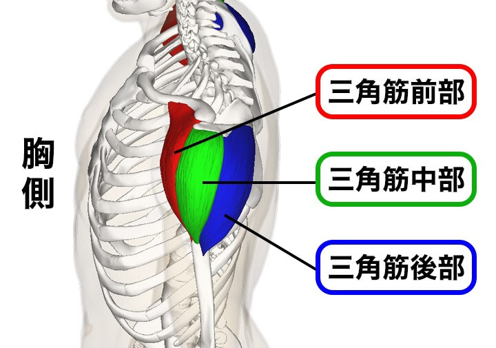 肩幅を効率よく広くする為に、最も鍛える必要がある筋肉部位は三角筋です。三角筋は前部・中部・後部の3つに分かれて構成されており、各部位を意識した筋トレをすることで丸みを帯びた肩に発達します。肩幅に直結するのは三角筋中部ですが、より広い肩幅に見せる為には肩に丸みを持たせて立体的に仕上げることがポイントです。