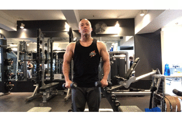 ③真っ直ぐではなく中央に寄せるイメージでダンベルを上げる
