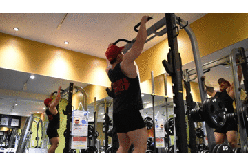 ショルダープレスは三角筋前部を効果的に鍛えることができる筋トレです。ショルダープレスは高重量でも行えるので、レイズ系の種目に加えて肩に高負荷を与えながら行うと肩幅を広げる効率が上がります。今回はバーベル版を紹介しますが、ダンベルを使用しても構いません。
