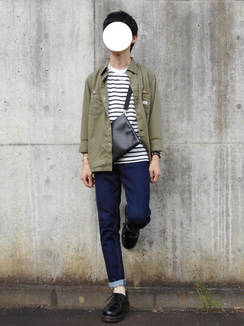 ミリタリーシャツの下に着ているカットソーやパンツ、足元のシューズを暗い色にすることでミリタリーシャツを引き立てたコーディネートに。明るい色のミリタリーシャツを着て引き立てたいときにはおすすめのコーディネートです。