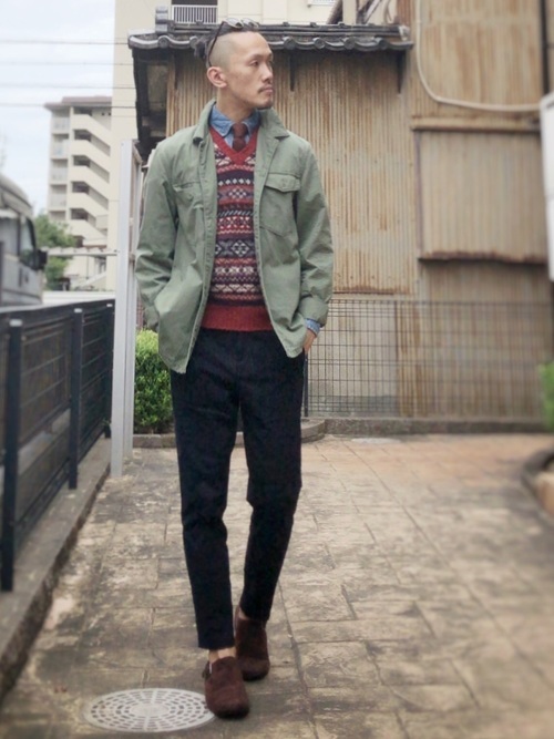 上はデニムシャツにネクタイ、ニットベスト、下はテーパードパンツのキレイ目コーデに合わせたミリタリーシャツ。いい具合に着崩し感が出ていて、キレイ目カジュアルコーデに仕上がってます。