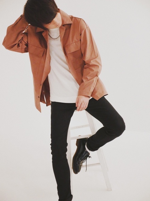 ミリタリーシャツがポケットなどついていてごちゃごちゃする分、インナーとパンツはあえてシンプルなものに。インナーのTシャツの丈を短めにすることで足長効果にもなります。スラックスと合わせてもキレイ目コーデになるでしょう。