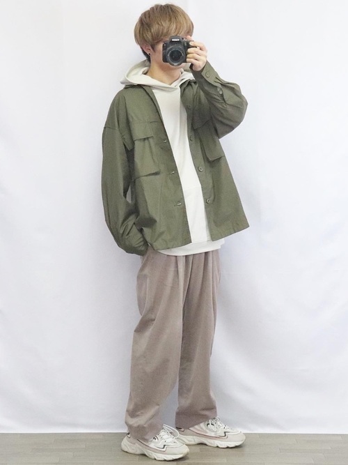 ますます涼しくなってくるこの季節。パーカーと合わせてもミリタリーシャツは相性良く着こなしができます。足元はあえてごついスニーカーにして差別化を図ってもいいでしょう。秋だけでなく春にも、使えるコーディネートです。