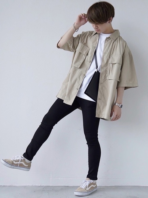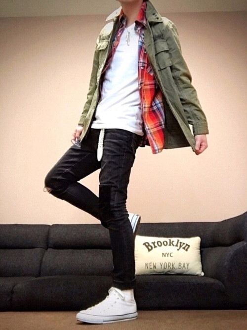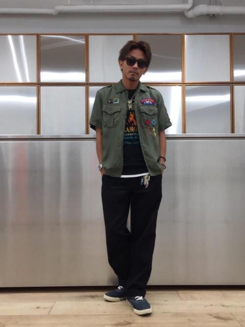 柄物のTシャツとワッペンの付いたミリタリーシャツで、上がこれまたごちゃごちゃした印象になっているコーディネート。こんな時は、パンツとスニーカーはシンプルにまとめるのが一番です。Tシャツの下から少し見えるタンクトップがグッとおしゃれに見せてくれます。