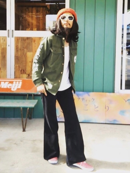 ミリタリーシャツに、ブーツカットのジーンズ。昭和な感じが懐かしいコーディネートです。ジーンズがブーツカットで裾が広がっているため、上はシンプルにスマートな着こなしに。人と差別化を図りたい方は、あえてこのような昭和テイストのコーディネートもおすすめです。
