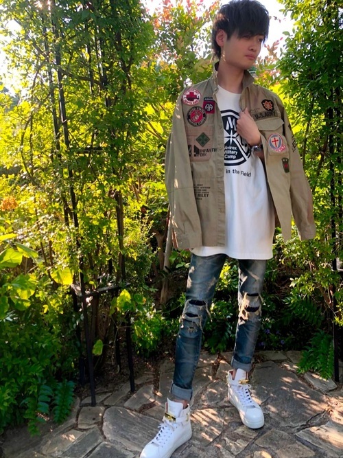 残暑が厳しい秋口には、Tシャツにミリタリーシャツを羽織るコーディネートもおすすめ。ミリタリーシャツにワッペンがたくさんついている時には、下をスキニーパンツなどですっきりと仕上げるとバランスが取れます。