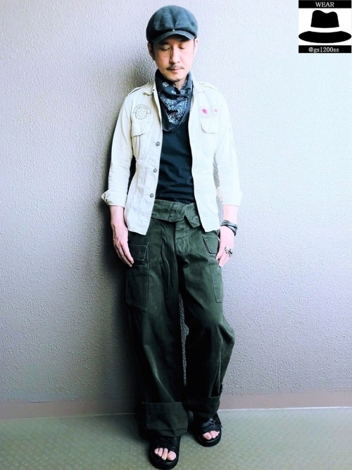 ミリタリーシャツにミリタリーパンツを合わせた上下軍仕様のものを着たコーディネート。一歩間違えると軍服オタクになってしまうため、上級者の着こなしと言えるでしょう。軍服オタクにならないようにコーディネートの中でハンチング帽子を被るなどして微調整しているところがポイントです。