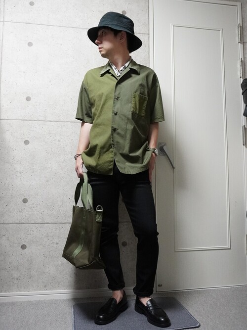 切り替えの入っているミリタリーシャツ。首元にバンダナも付けているため、上はごちゃごちゃした印象。したがって、下は黒のスキニーですっきりと仕上げています。ハットとレイザーシューズを履けばキレイ目コーデになります。バッグはミリタリーシャツの色に合わせることでまとまりのあるコーディネートにすることができるでしょう。