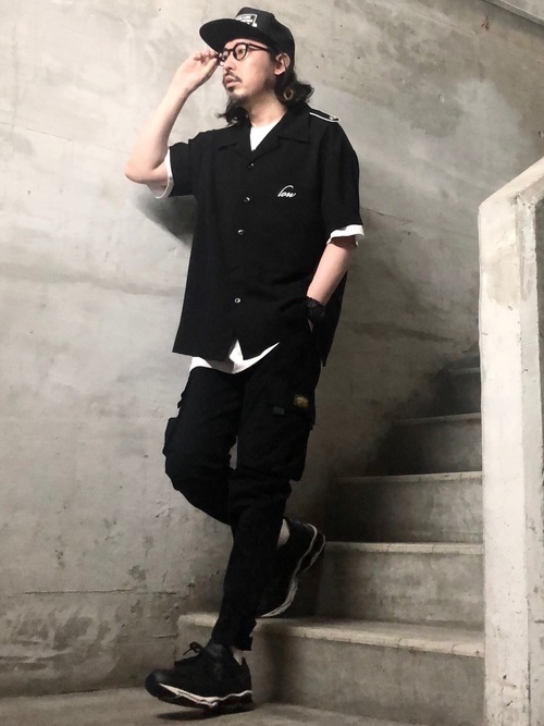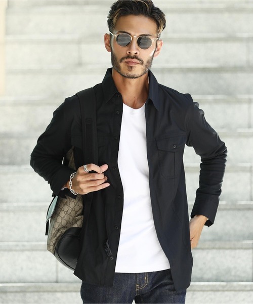 黒のシンプルなミリタリーシャツ。インナーのTシャツの白い部分が襟、袖口の部分からちらっと見せてコーディネート。シンプルなミリタリーシャツなので、スキニーやワイドパンツ、スラックスなど様々なパンツに合わせやすいシャツです。