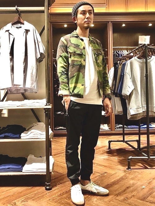 迷彩柄のこれぞザ・ミリタリーシャツ。迷彩柄なのでインナーはシンプルなもので合わせるのが一般的。柄物や色物を取り入れてもいいですが、ごちゃごちゃしがちになるので着こなしが難しくなりるでしょう。下はシンプルなトレジャーパンツと合わせてカジュアルなコーディネートに。足元をインナーと合わせることでまとまりのある着こなしになります。