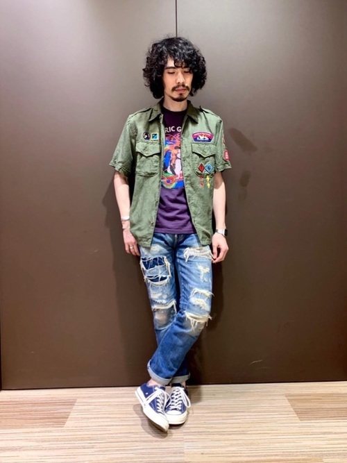 カーキーの半袖ミリタリーシャツに、インナーにはカラーシャツ。下のジーンズはダメージジーンズとかなりワイルドなコーディネート。ワイルドな着こなしで、他の人と差を付けたいならこんなコーディネートもおすすめです。