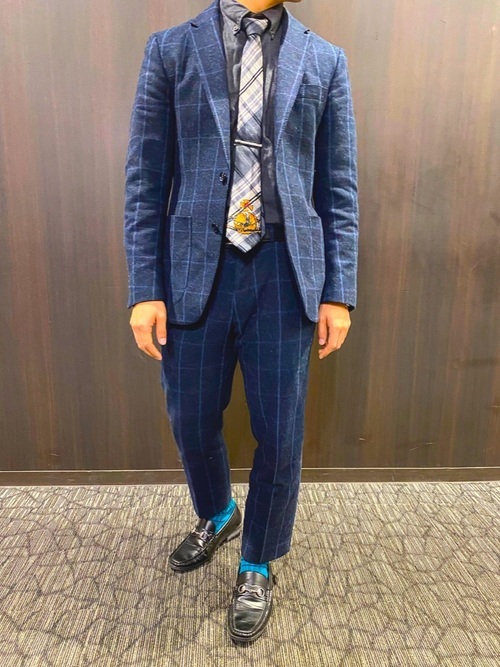 こちらはチェックのセットアップです。チェック柄はセットアップにすると日常では合わせづらい雰囲気になりますが、ネイビーならその問題も解決。ビジネス用としても使える着こなし。革靴を合わせることで思い切りドレッシーに着るのがおすすめです。
