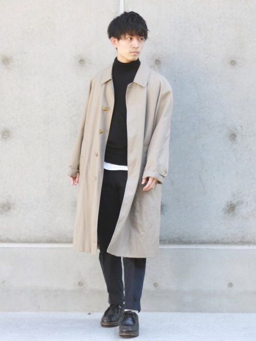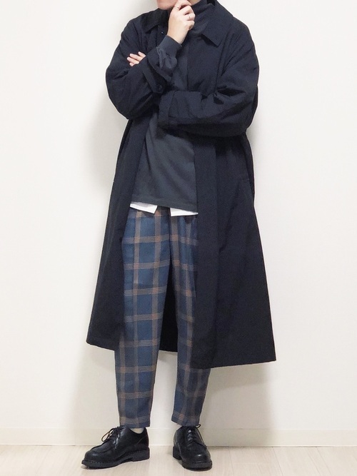 長めのコートにネイビーパンツを合わせた大人っぽい着こなしです。トップスに黒、ボトムスに紺と暗いカラーを多く使っていますが、コートのカラーがベージュと明るめなので全体に重すぎるいんしょうを与えません。