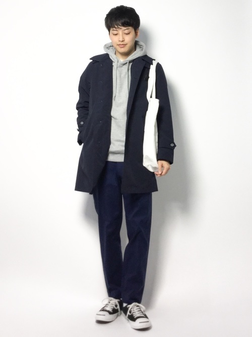 パンツと同系色の紺色をコートに取り入れたコーデです。紺の色味は少し違いますが、チノパンと素材感の似ているコートを選択しているため、しっくりと馴染んでいます。