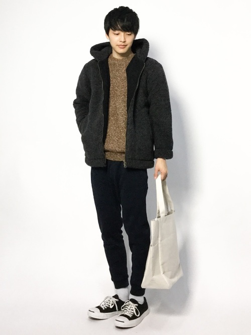 流行のボアパーカーもネイビーパンツと相性が良いアイテム。トップスに思い切りボリュームを出しているので、ボトムスはぴったり目をセレクト。全体的にリラックスアイテムをそろえた着こなしです。