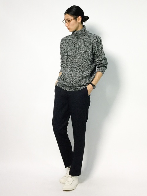 タートルネックは上半身に重さが出るのがポイントです。ということで、ボトムスはシンプルに細身のものを合わせるのが鉄則。こちらはスラックスをセレクトしていますが、チノパンに変えると一気にカジュアルな雰囲気になります。同素材のジャケットと合わせてジャケパンスタイルにも応用可能です。