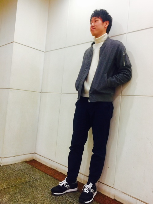 白のタートルネックは実は男性には難しいアイテムです。しかしこちらのコーデでは細身のジョガーパンツやブルゾンと合わせることできれいめスポーティーな雰囲気に昇華しています。