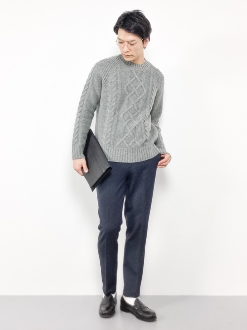 模様編みのセーターは女子ウケが最高に良いアイテムなので持っておいて損はありません。切れ目のスラックスと合わせればビジネスにも通用するおしゃれなスタイルに。もちろん紺のチノパンやデニムなどカジュアルなボトムスと合わせれば街着としても通用します。ジャケパンスタイルにも応用が可能な着こなしです。