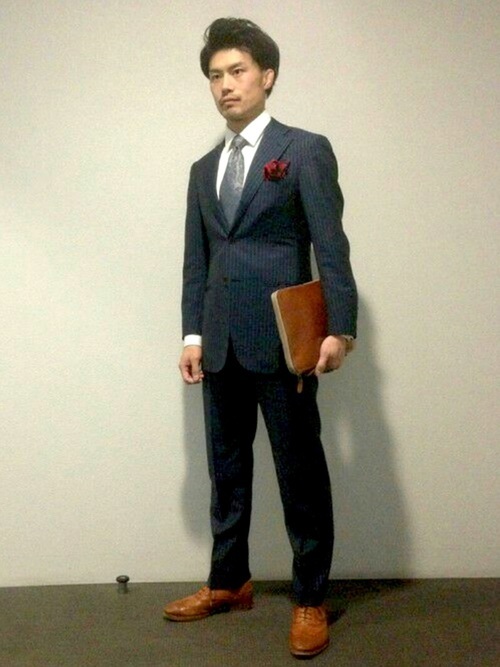 こちらはビジネスにも通用するコーデ。高級スーツだからといって滅多に着用しないのは実はコスパが悪いものです。高級スーツだからこそ、日常生活で着用できるといいでしょう。こちらのコーデではクラッチバッグとシューズのカラーを合わせて全体を上品にまとめています。