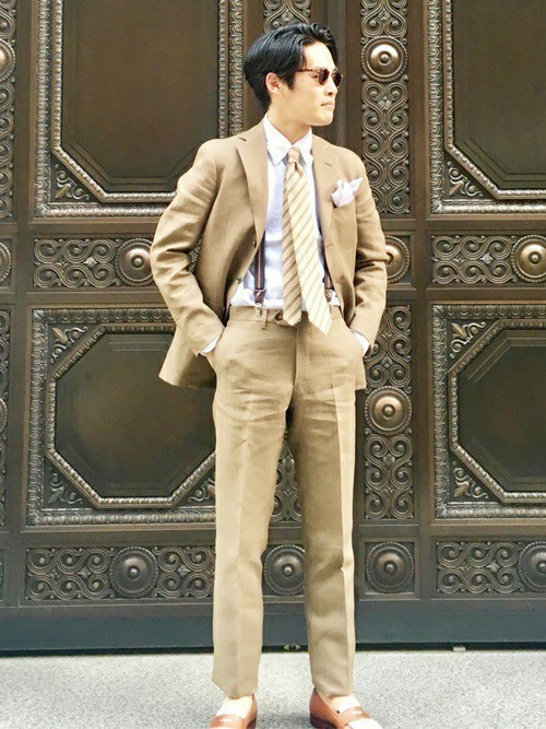 明るいブラウンのセットアップは春夏におすすめのカラーです。スーツを着用しなければいけないシーンでも軽やかに明るい雰囲気に見せてくれるもの。こちらのコーデではチラリとのぞくサスペンダーが大人の遊び心を感じさせます。イギリススタイルでの着こなしは高級スーツにぴったりです。