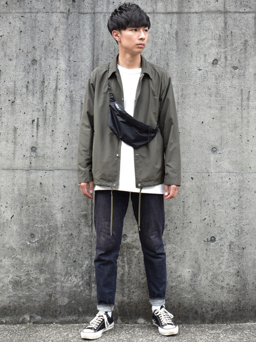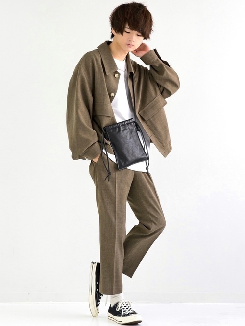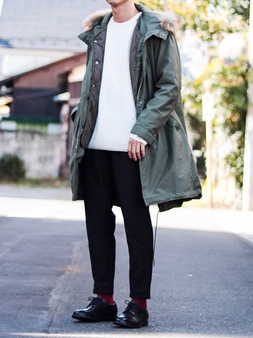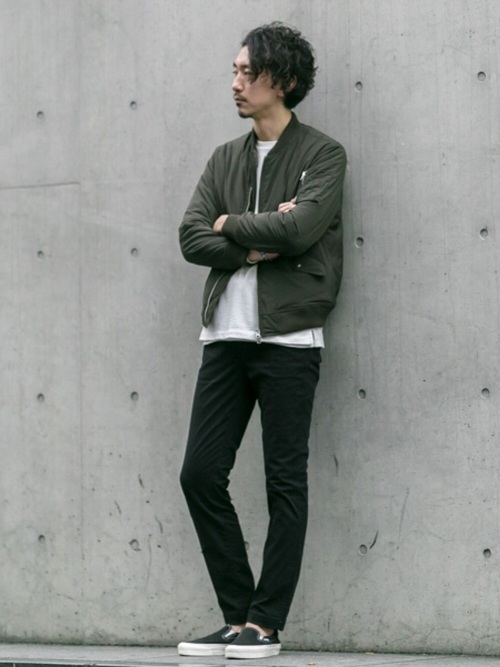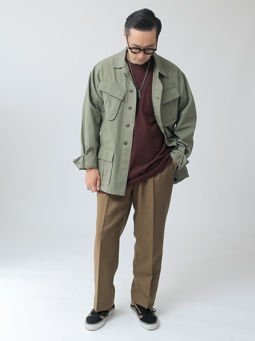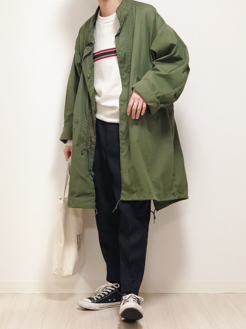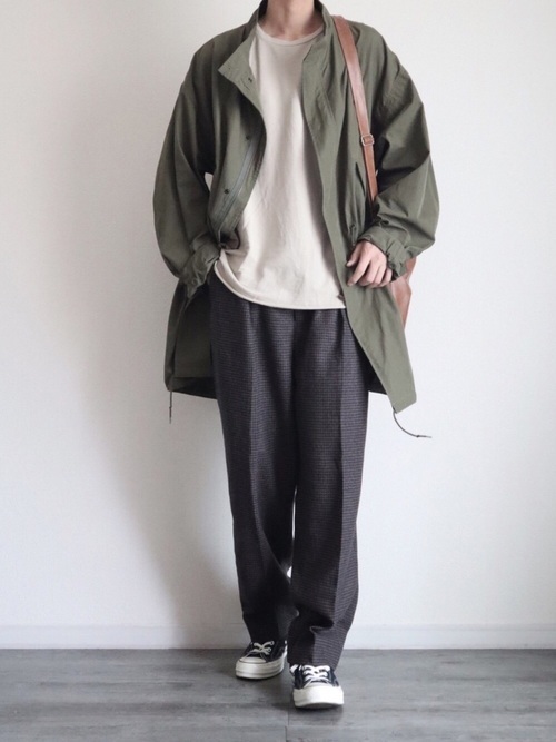 ミリタリーテイストなM-65は、カジュアルなイメージが強いですが、きちんと感のあるスラックスを合わせることできれいめコーデに仕上がります。全体的にダボっとしたシルエットなので、足元はコンバースのスニーカーでコンパクトにまとめましょう。