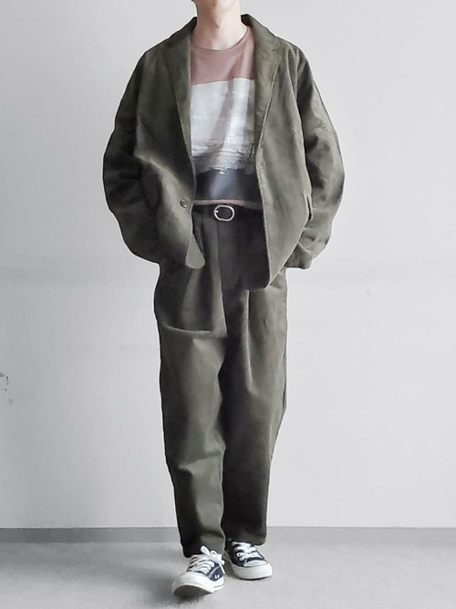 カーキのジャケット×パンツのセットアップは、簡単におしゃれに見える優秀アイテムです。春は、カーキアイテムが重たく見えやすいので、白のインナートップスで抜け感を演出しましょう。足元はあえてスニーカーでカジュアルダウンするのがトレンドです。