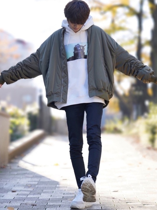 カーキのミリタリーブルゾンのインナーにパーカーを合わせるのは定番人気です。モノトーン系のパーカーにマンネリしたら、思い切ってカラー系のパーカーにチャレンジしてみてはいかがでしょうか。カーキ×明るいグリーンの組み合わせが新鮮ですね。スキニーパンツの足元は、ボリュームのあるダッドスニーカーを選ぶのがトレンドです。