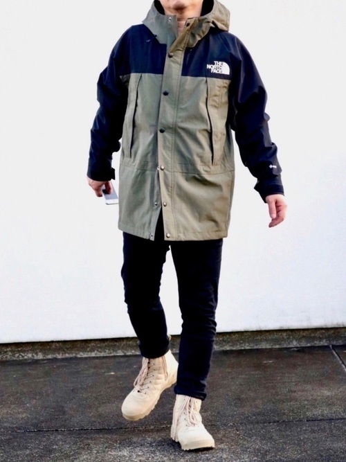 カーキのマウンテンパーカーにクライミングパンツを合わせたアウトドアテイストのメンズコーデです。モノトーンカラーでまとめることで、アウトドア系のアイテムもスタイリッシュな印象に仕上がります。インナーは白Tシャツを選べば失敗しにくいですよ。