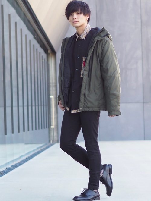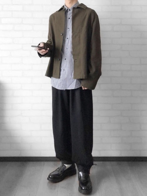 コンパクトなカーキアウターのインナーは、ブルー系のチェックシャツを合わせることでヘルシーな印象を与えてくれます。ボトムは、あえて太めのイージーパンツを選ぶとメリハリが出ますね。