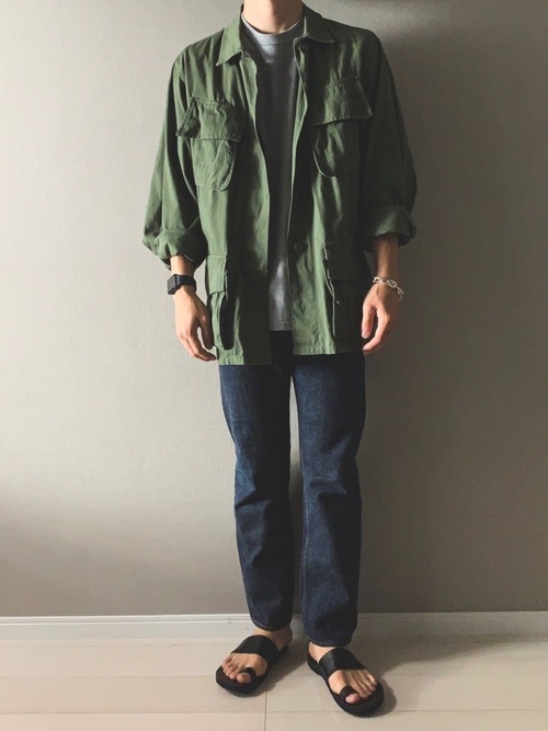 薄手のカーキミリタリージャケットは、春だけでなく夏まで活躍します。大人っぽく見せたいなら、デニムパンツは濃いめのカラーがおすすめです。足元はサンダルで夏らしい軽やかさをプラスしましょう。