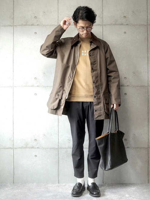 カーキのコートにロゴスウェットをインしたカジュアルコーデも、足元にローファーを合わせることできれいめに着こなせます。アンクルパンツの裾から白靴下をチラっと見せることで、こなれ感がアップします。