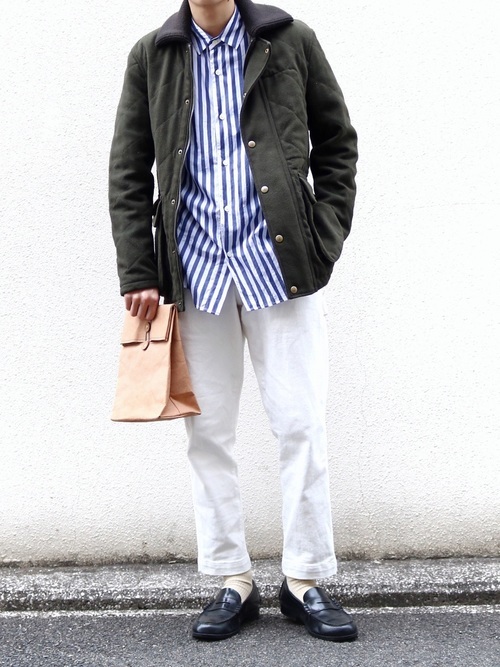 ミリタリーテイスなキルティングブルゾンのインナーに爽やかなストライプシャツを選ぶと、男臭さが中和されます。きれいめコーデが好きな人も、取り入れやすい組み合わせです。