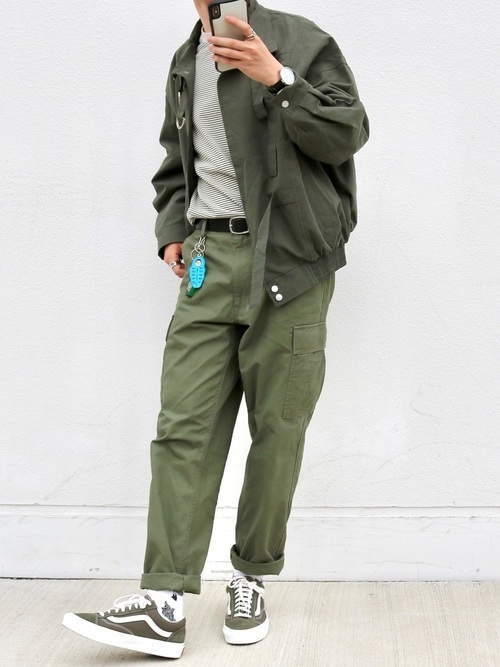 カーキのブルゾンにカーキのカーゴパンツを合わせたセットアップ風コーデは、こなれ感たっぷりですね。ワントーンで仕上げることで、ミリタリーアイテムもワイルドになりすぎず、デイリーコーデに馴染みやすいですよ。