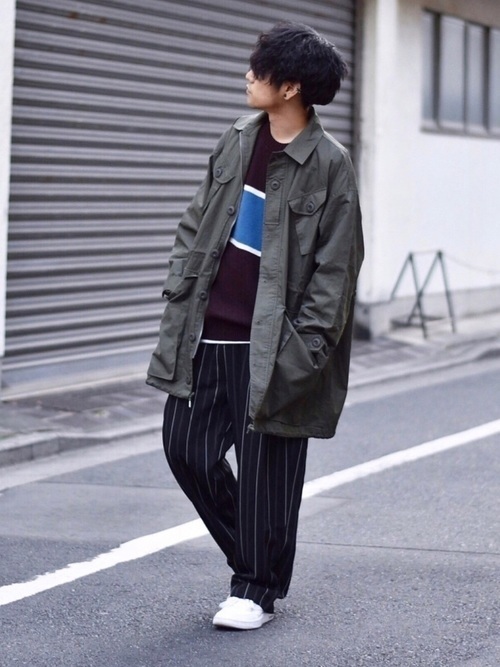ビッグシルエットのミリタリージャケットは、ストライプ柄のパンツで縦のラインを際立たせてすっきり見えを狙いましょう。ダークカラーのコーデにブルーのボーダーカラーが引き立ちますね。足元は、白のスニーカーで、抜け感のあるおしゃれに仕上がっています。