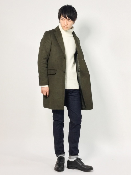 カーキのチェスターコートに白のタートルニットをインすれば、好印象なきれいめコーデにまとまります。冬のアウターコーデは着膨れしやすいので、スキニーパンツを合わせてメリハリをつけましょう。