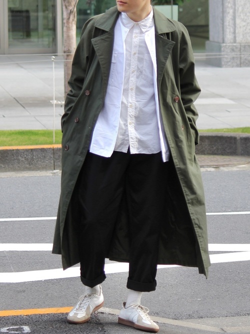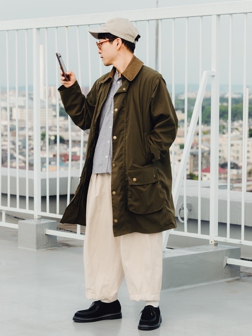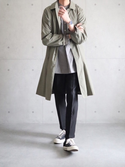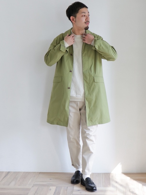 淡いグリーン系のカーキコートに、オフホワイトのインナーやパンツを合わせることで爽やかな着こなしに仕上がります。淡い色だけだとぼやけて見えるので、足元は黒のローファーで引き締めるのがポイントです。